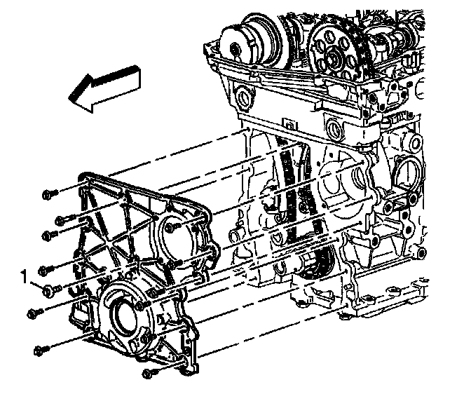 6. Install the front cover bolts, tightening the center bolt last (1).
