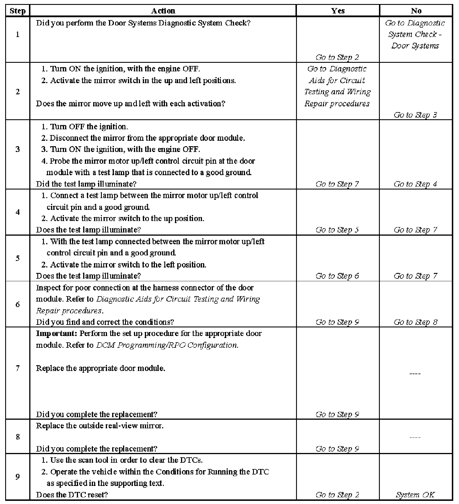 ^ If the mirror motor up/left control circuit is shorted to battery voltage and the mirror is commanded down or right.