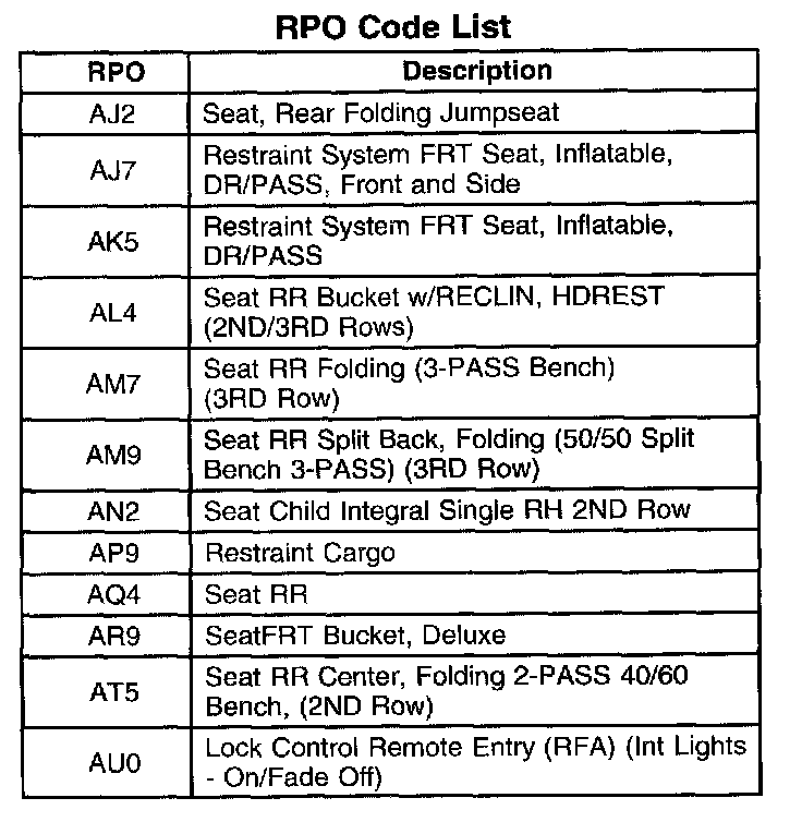 The table provides the description of the Regular Production Option (RPO) codes that are available on the vehicle. The vehicle's RPO list is printed on the Service Parts Identification Label.
