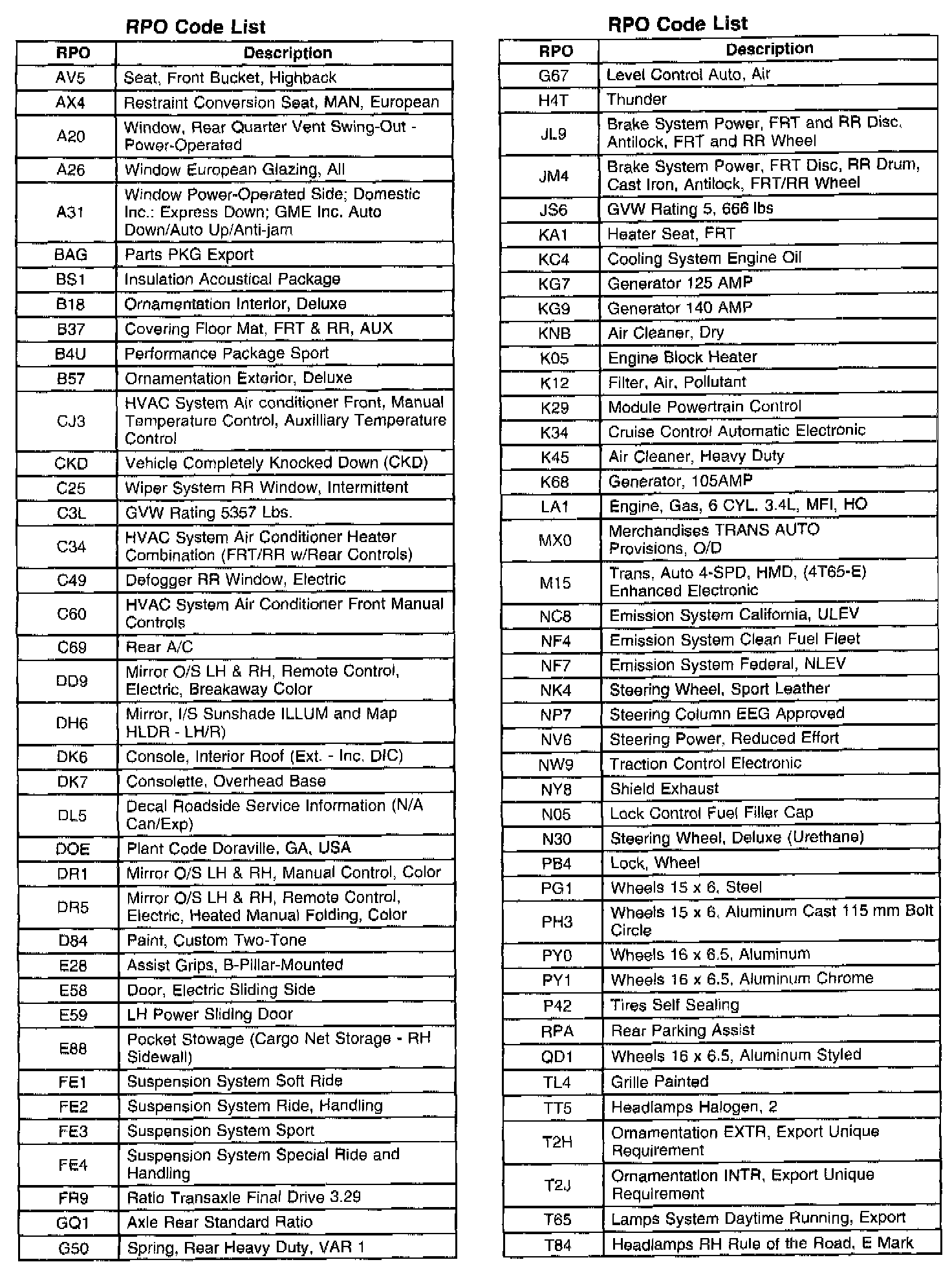 RPO Code List Part 1:
