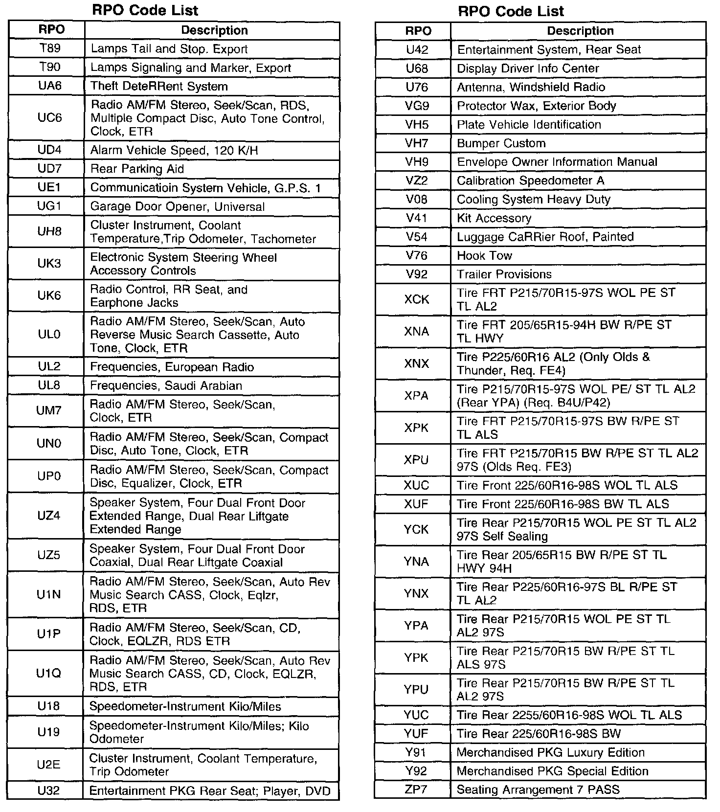 RPO Codes