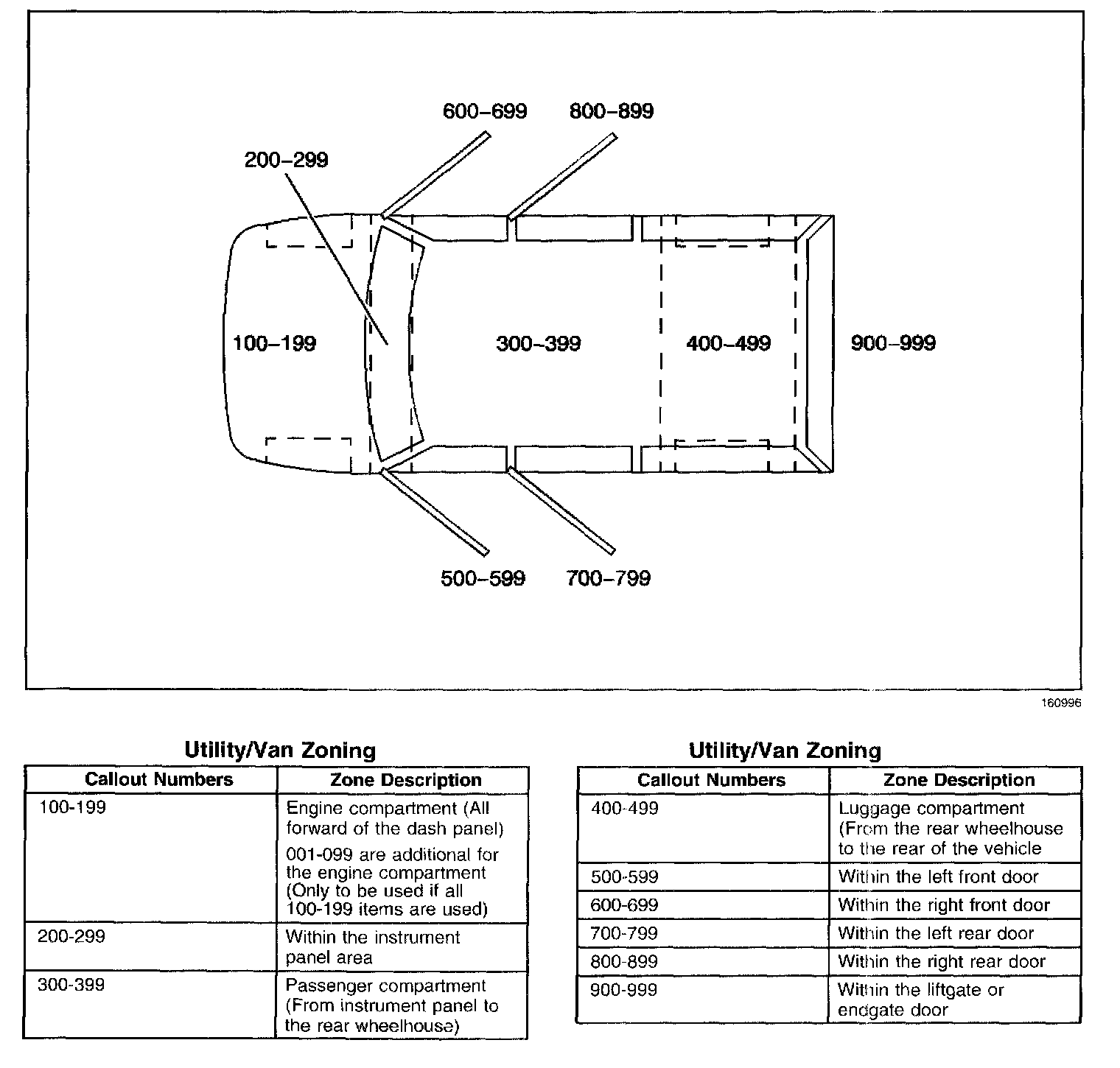 All grounds, in-line connectors, pass-through grommets, and splices have identifying numbers that correspond to where they are located in the vehicle. The following table explains the numbering system.