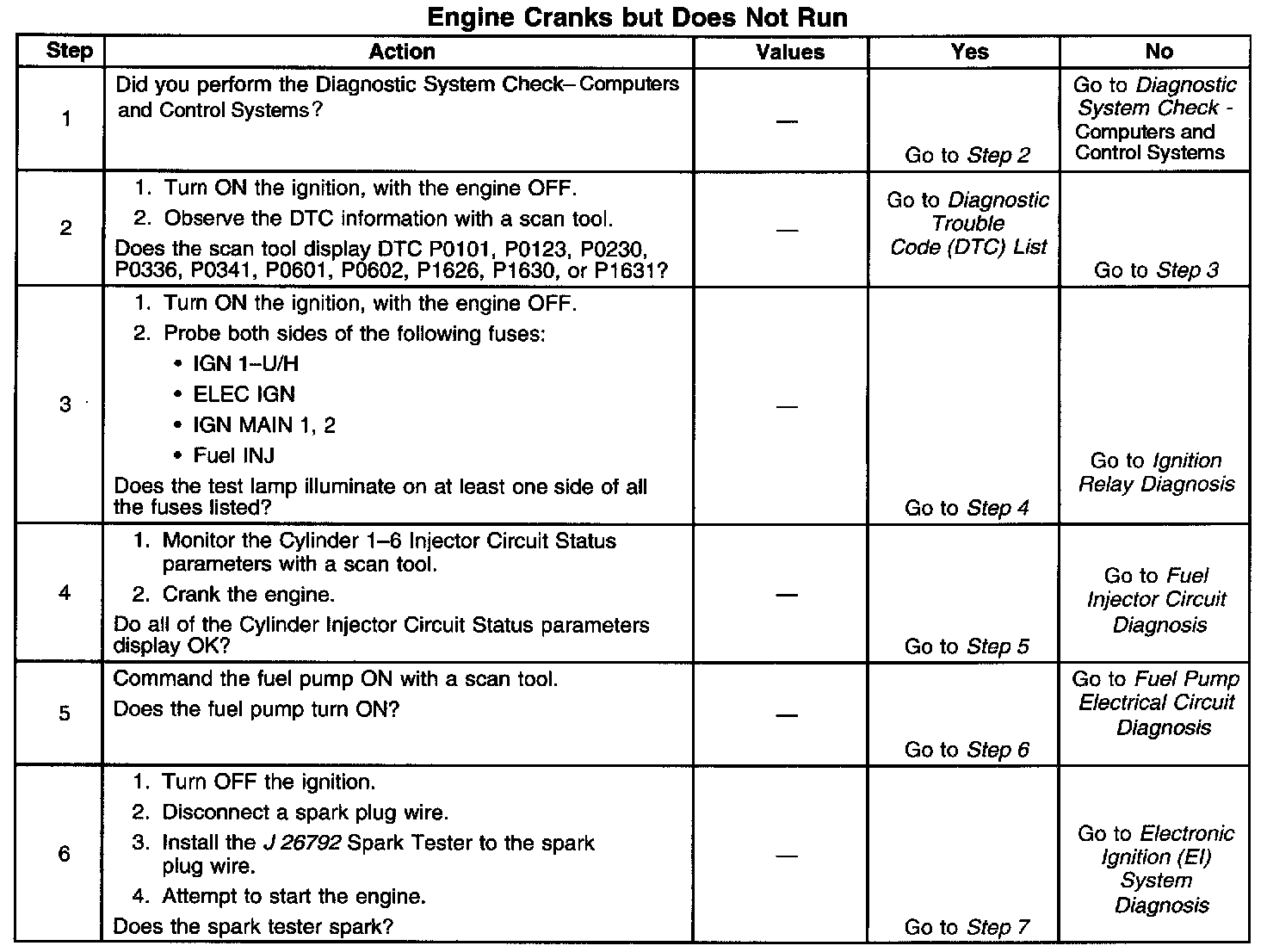 DESCRIPTIONThe Engine Cranks but Does Not Run diagnostic table is an organized approach to identifying a condition that prevents an engine from starting. The Engine Cranks but Does Not Run diagnostic table directs the service technician to the appropriate system diagnosis.
