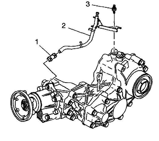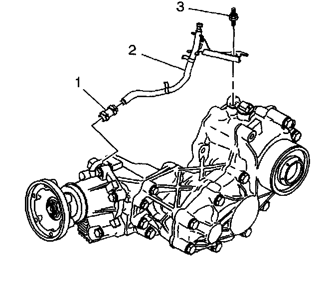 3. Disconnect the vent hose (2) from the retaining bracket on the transfer case assembly.