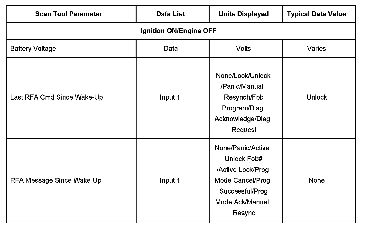 The Keyless Entry Scan Tool Data List contains all of the keyless entry related parameters that are available on the scan tool. The parameters in the list are arranged in alphabetical order. The column, "Data List," indicates the location of the parameter within the scan tool menu selections. Use the Keyless Entry Scan Tool Data List as directed by a diagnostic table or in order to supplement the diagnostic procedures. Begin all of the diagnostic procedures with Diagnostic System Check - Remote Keyless Entry .