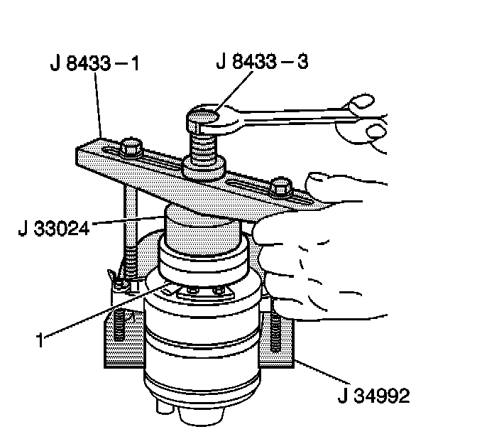 8. Turn the center forcing screw of the J 8433-1 in order to force the clutch coil onto the front head. Ensure that the clutch coil and the J 33024 remain aligned during installation.
