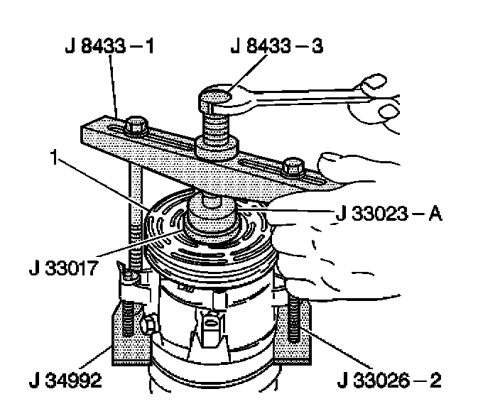 16. Tighten the center screw in the J 8433-1 in order to force the pulley rotor and bearing assembly onto the compressor front head.