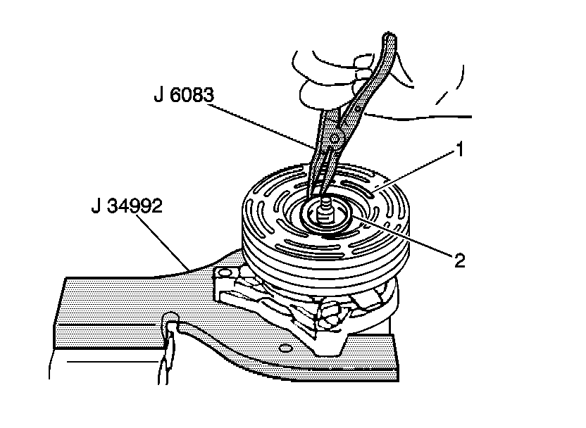 12. Tighten the J 8433-3 against the puller pilot in order to remove the clutch coil (2).