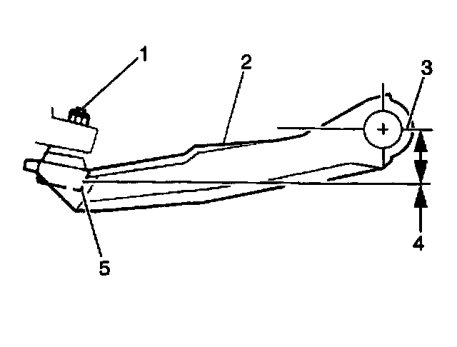 3. Measure from the pivot bolt center line (2) down to the lower corner (5) of the steering knuckle (1) in order to obtain the Z height measurement (4).