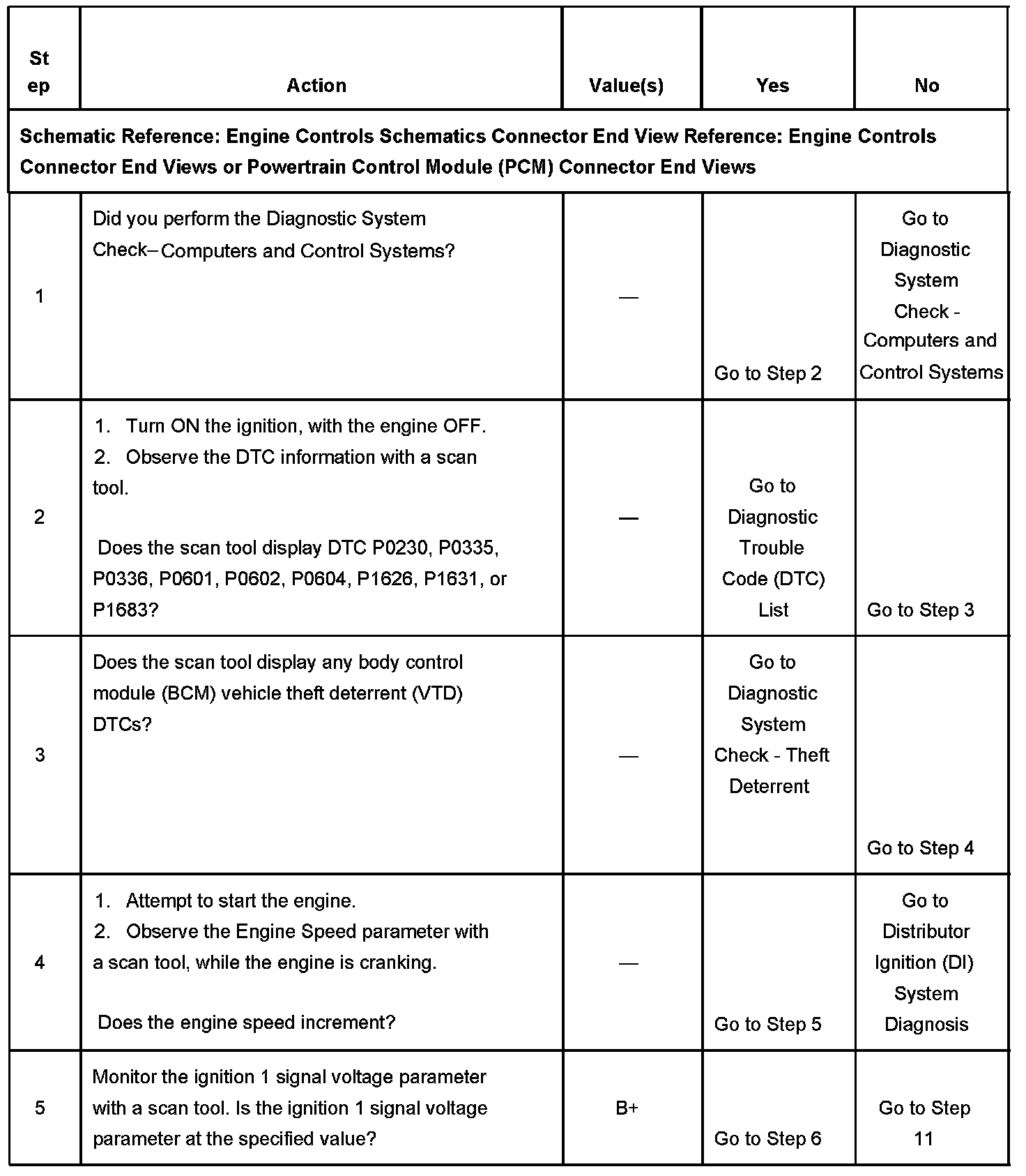 DESCRIPTIONThe Engine Cranks but Does Not Run diagnostic table is an organized approach to identifying a condition that prevents an engine from starting. The Engine Cranks but Does Not Run diagnostic table directs the service technician to the appropriate system diagnosis.