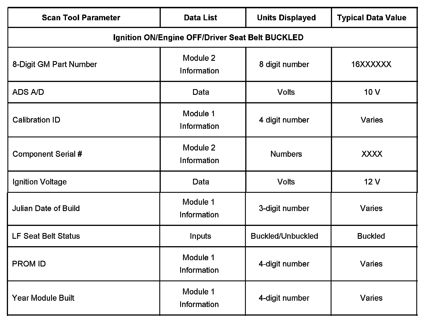 The Typical Data Values are obtained from a properly operating vehicle under the conditions specified in the first row of the Scan Tool Data List table. Comparison of the parameter values from the suspect vehicle with the Typical Data Values may reveal the source of the customer concern.