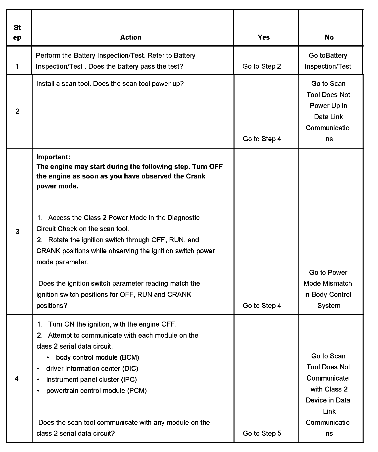 4. Lack of communication may be due to a partial malfunction of the class 2 serial data circuit or due to a total malfunction of the class 2 serial data circuit. The specified procedure will determine the particular condition.