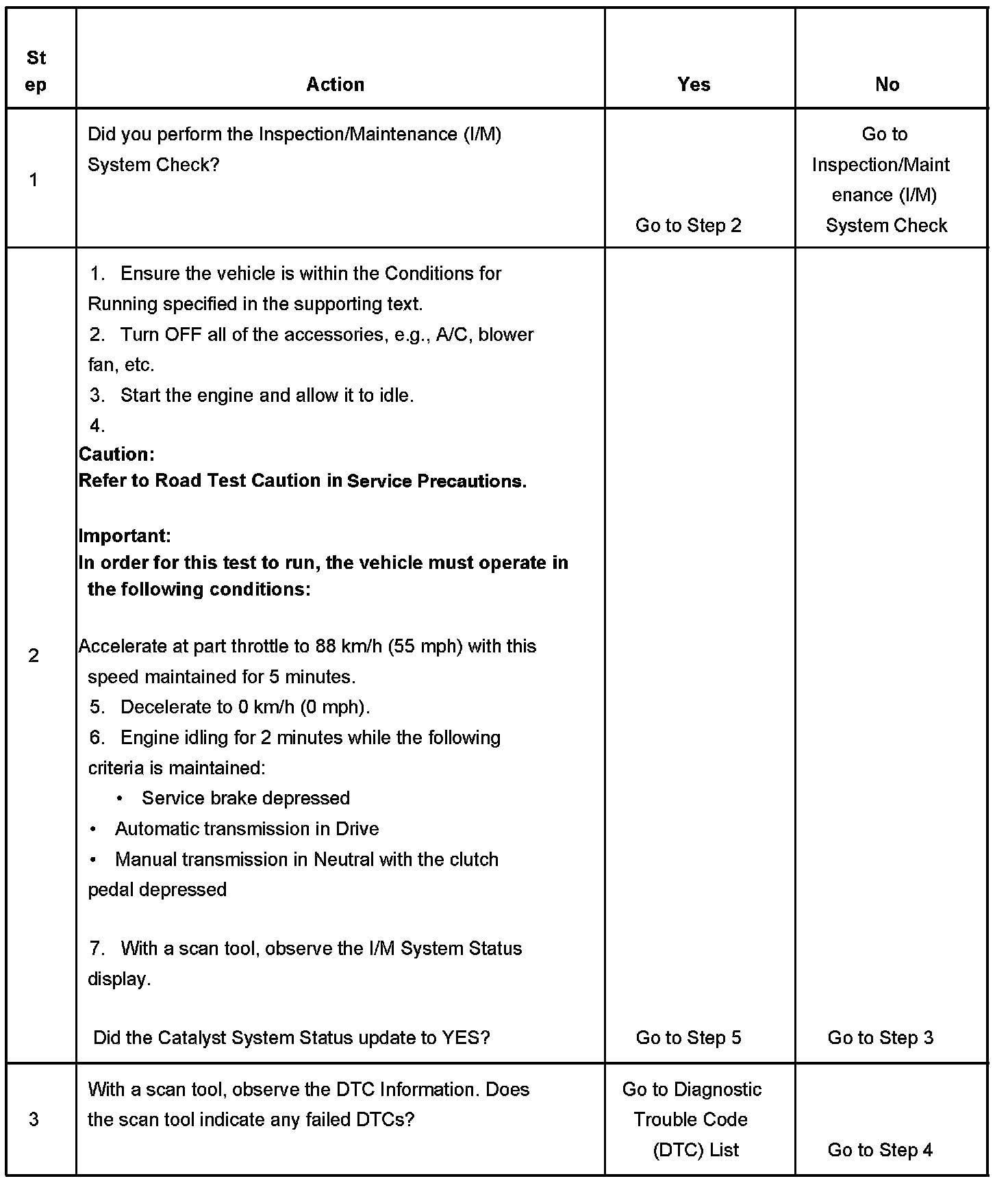 The purpose of this test is to satisfy the enable criteria necessary to execute I/M readiness diagnostics for the catalyst system. The test may be used to set the I/M System Status indicators to YES. Ensure the vehicle meets the requirements listed in Conditions for Running before performing this test. Failure to meet the necessary requirements may produce incomplete test results.