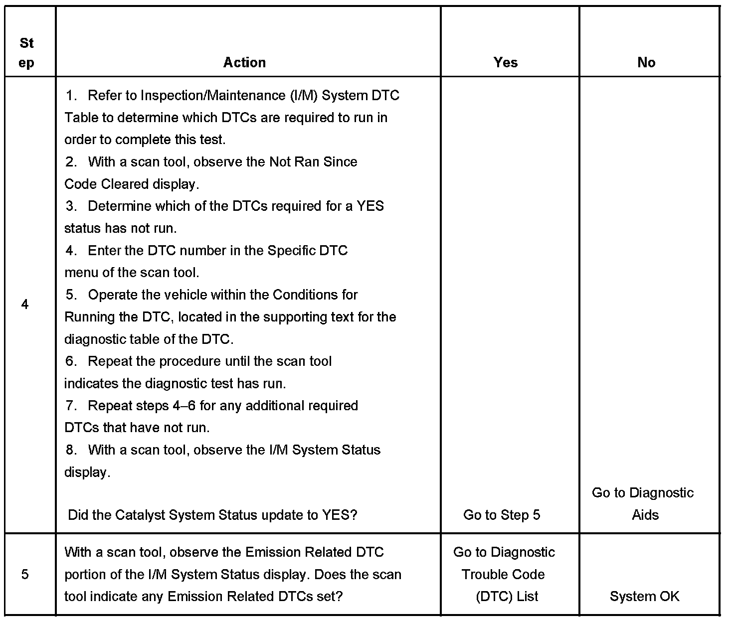 3. This step is to identify a first failure of a type B DTC. A DTC only appears on the I/M System Status display when it becomes a MIL illuminating DTC. This occurs on the second failure of a type B DTC. A first failure of a type B DTC will not allow the I/M System Status to update to YES. Refer to Diagnostic Aids.