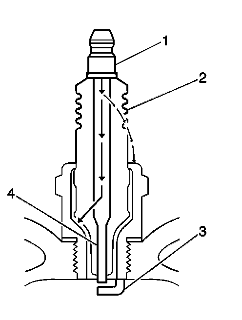 - Inspect for signs of tracking that occurred near the insulator tip instead of the center electrode (4).