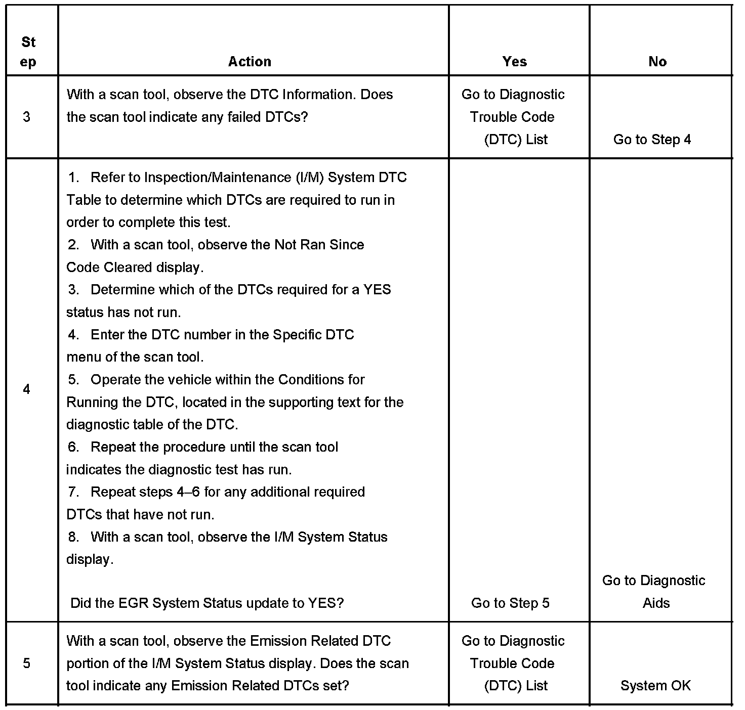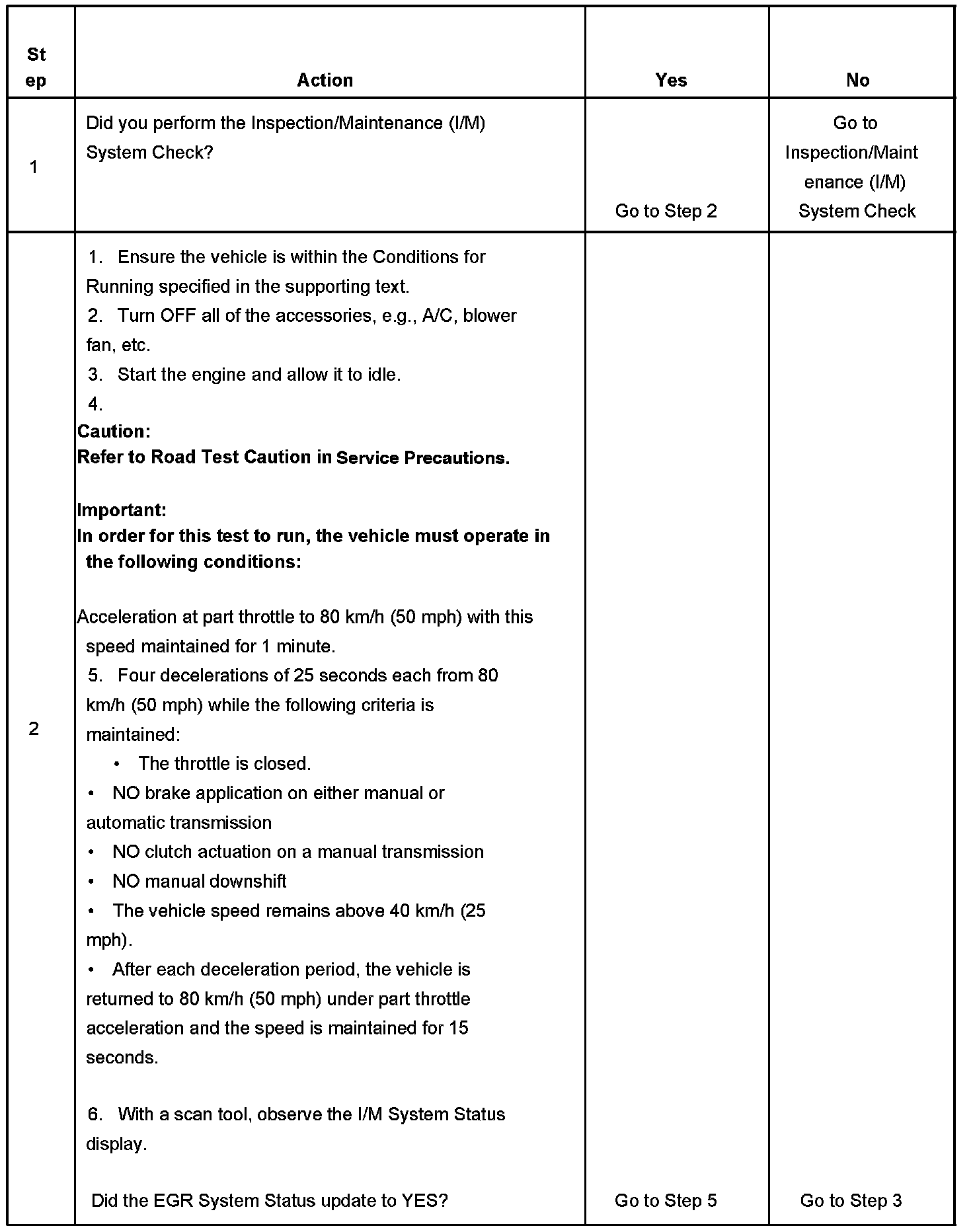 Several deceleration cycles may be necessary in order to accumulate a sufficient number of EGR flow samples. The procedure outlined in the table is for a clear, flat road. If the procedure is performed on a road with a slight down hill grade, the test may acquire the necessary sample counters in one or two decel trips. If the test is interrupted during the procedure, it may take more than three deceleration cycles to complete the test. If the status does not update, the test outlined in this procedure can be repeated until the I/M System Status updates to YES.