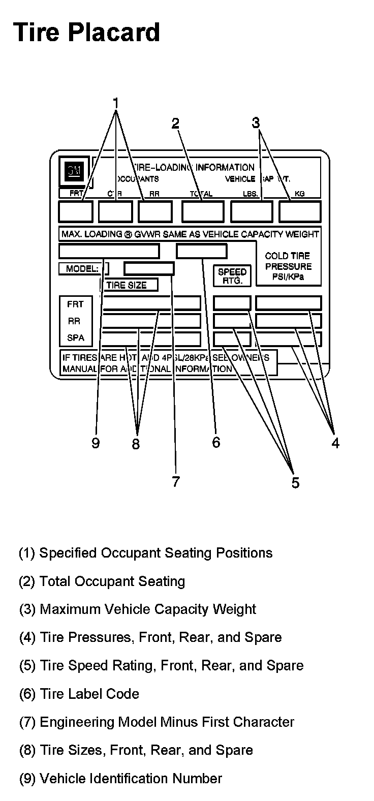 The Tire Placard is permanently located on the edge of the driver's door. Refer to the placard in order to obtain the following information:
