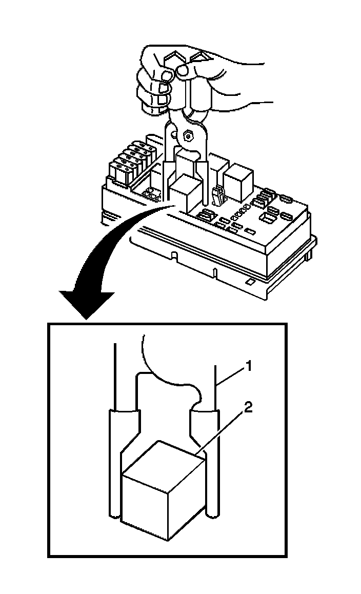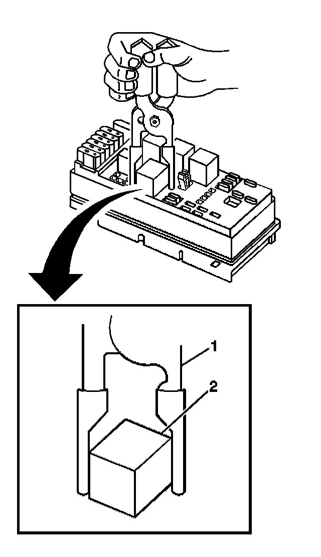 3. Using the J 43244 (1) position the tool on opposing corners of the compressor relay (2).