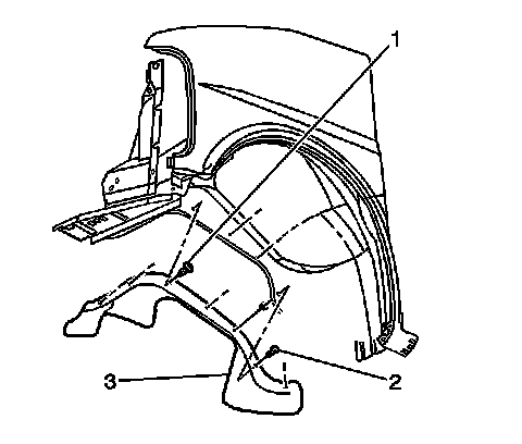 3. Install the push pin retainers (1) in order to retain the splash shield (3) to the wheelhouse.