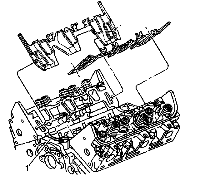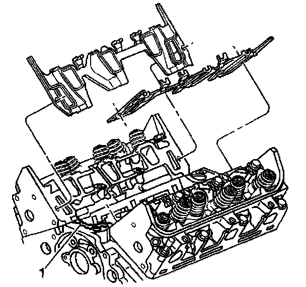 6. With gaskets in place, apply 8 - 10 mm (0.39 - 0.39 inch) bead of RTV Sealer, GM P/N 12346141 (Canadian P/N 89022195) or the equivalent, to the 4 corners of the intake manifold to block joint. (1).