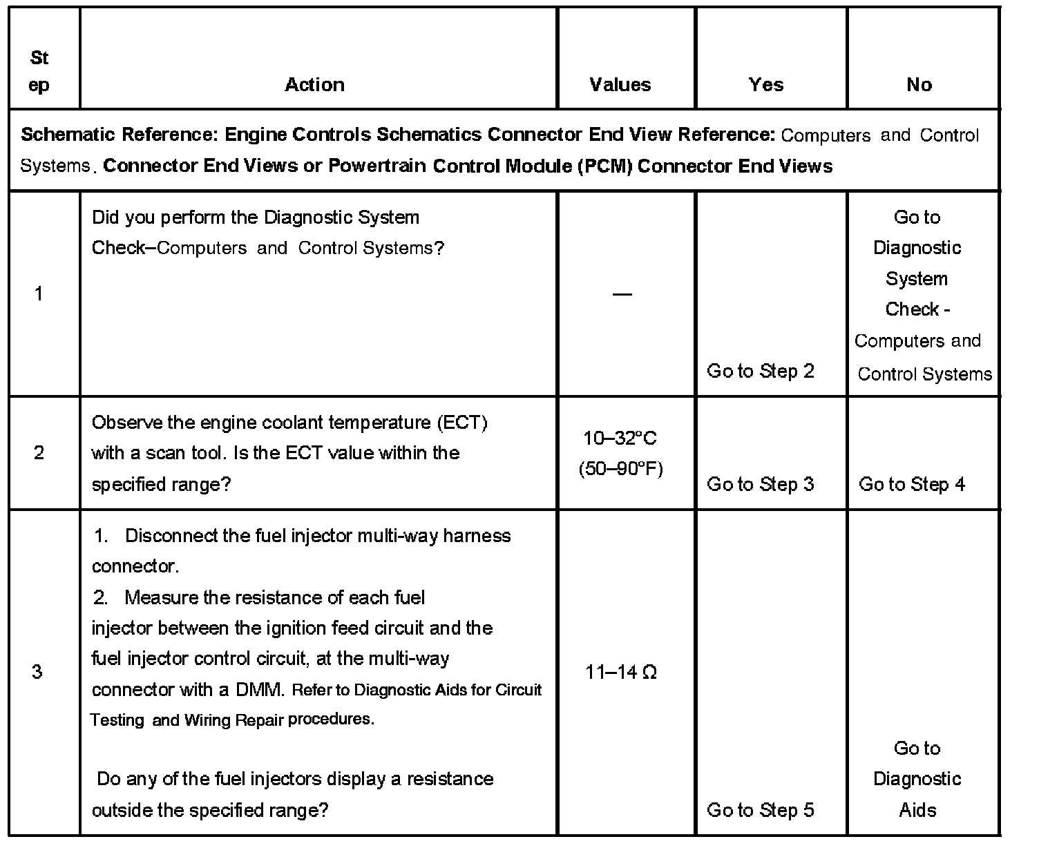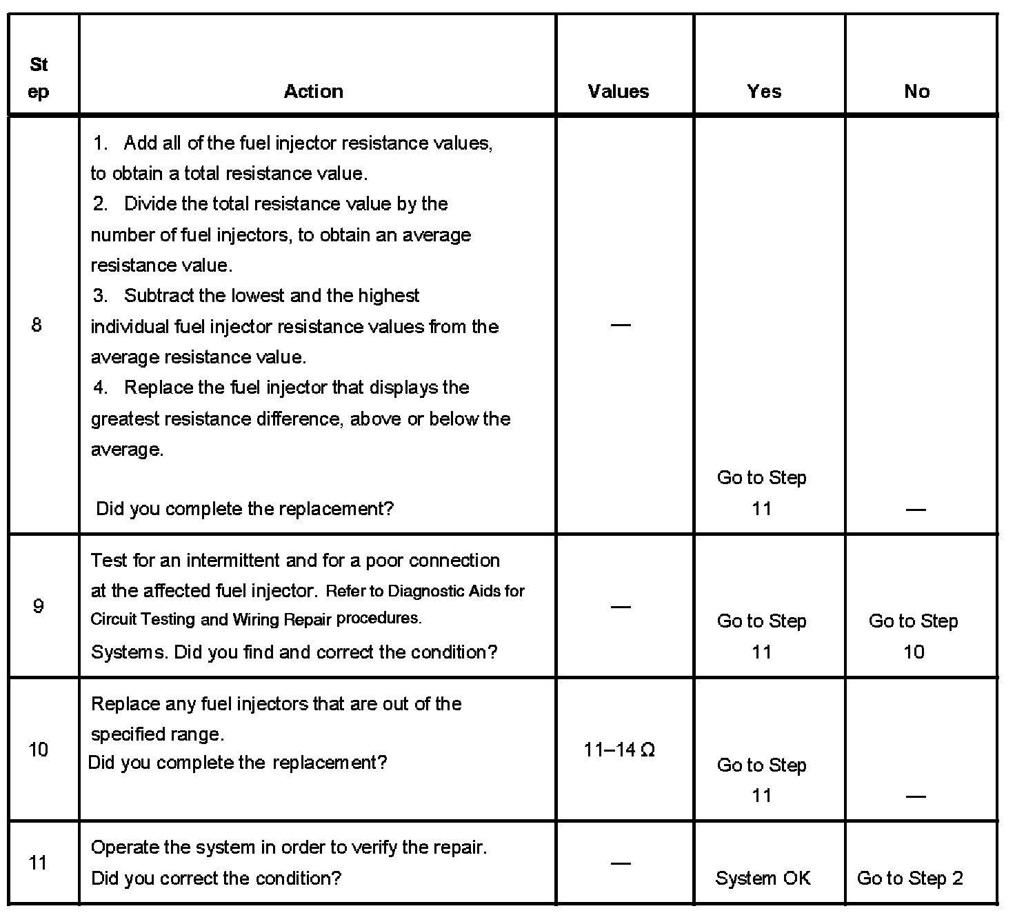 3. This step tests each fuel injector resistance within a specific temperature range. If any of the fuel injectors display a resistance outside of the specified value, replace the fuel injector.
