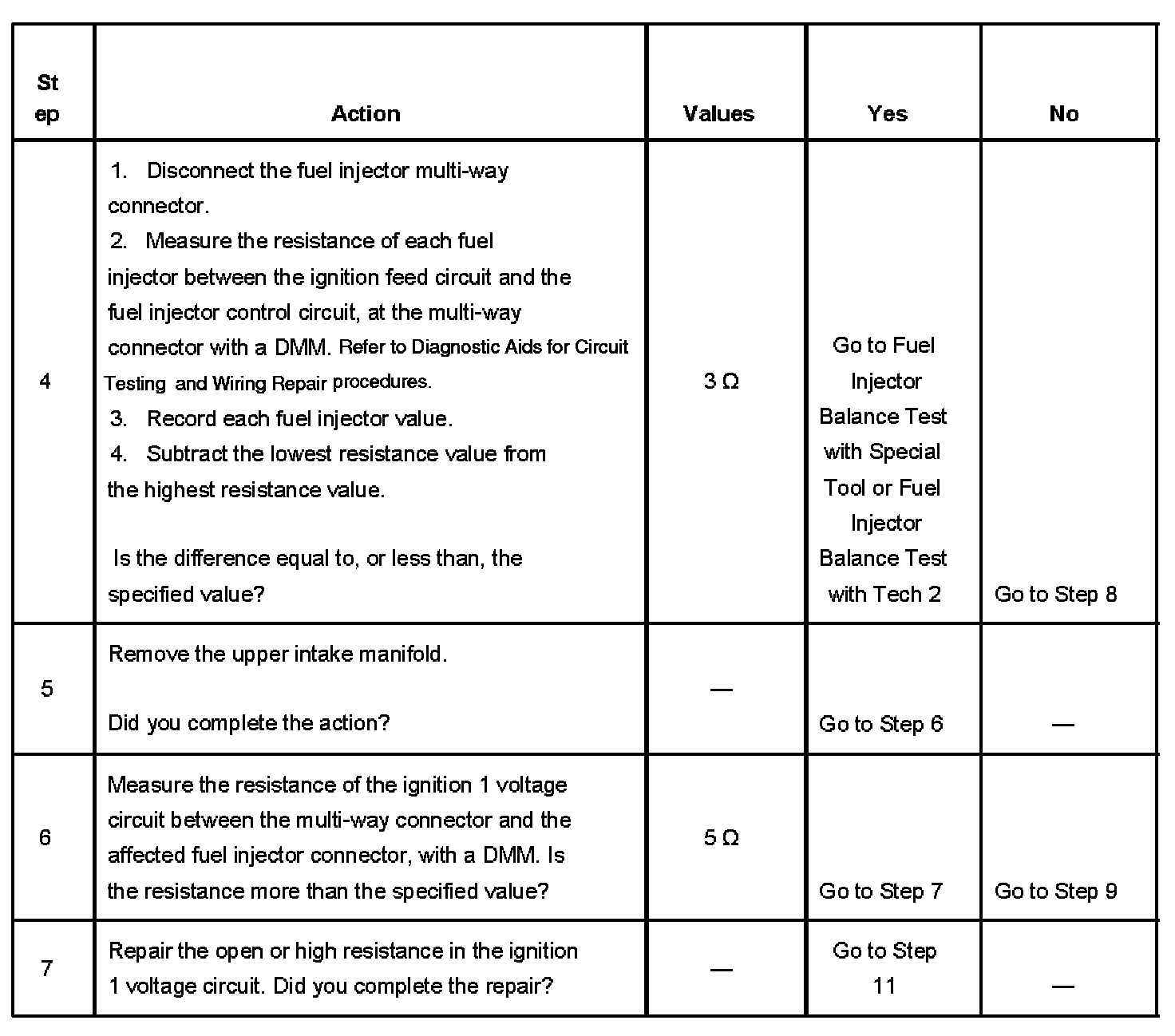 4. This step determines if all of the fuel injectors are within 3 ohms of each other. If the highest resistance value is within 3 ohms of the lowest resistance value, then all of the fuel injector coil windings are OK.