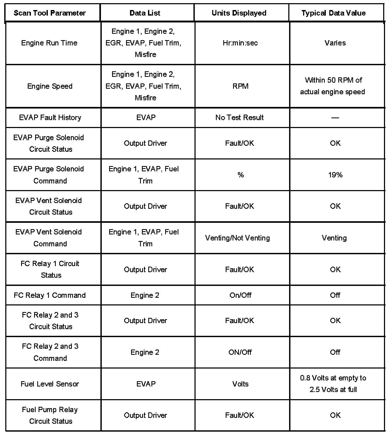 - Evaporative emission (EVAP) Data-Contains information specific to the EVAP control system. Also displays parameters required to verify proper EVAP system operation.