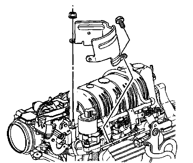 9. Remove the Exhaust Gas Recirculation Valve (EGR) wiring harness heat shield nut, bolt and the EGR heat shield.