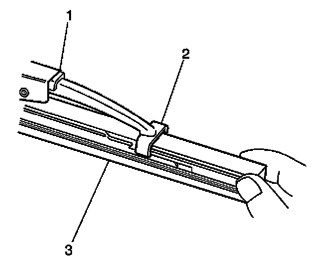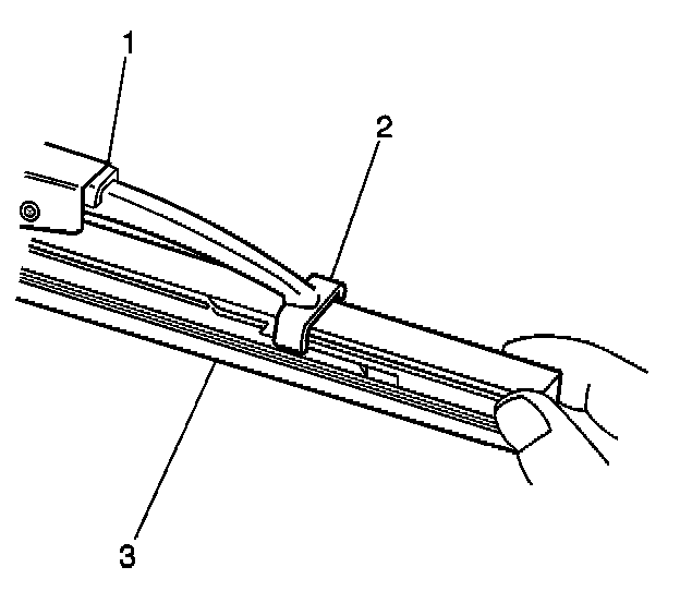 3. Engage the bottom claw (2) of the wiper blade (1) into the notches in wiper blade element (3).