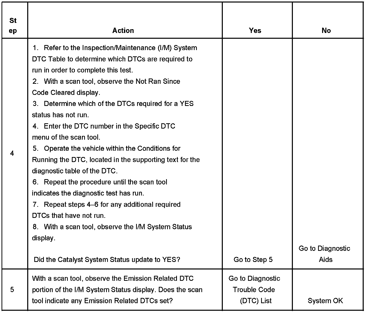 3. This step identifies a first failure of a type B DTC. A DTC only appears on the I/M System Status display when DTC becomes a MIL illuminating DTC. This occurs on the second failure of a type B DTC. A first failure of a type B DTC will not allow the I/M System Status to update to YES. Refer to Diagnostic Aids.