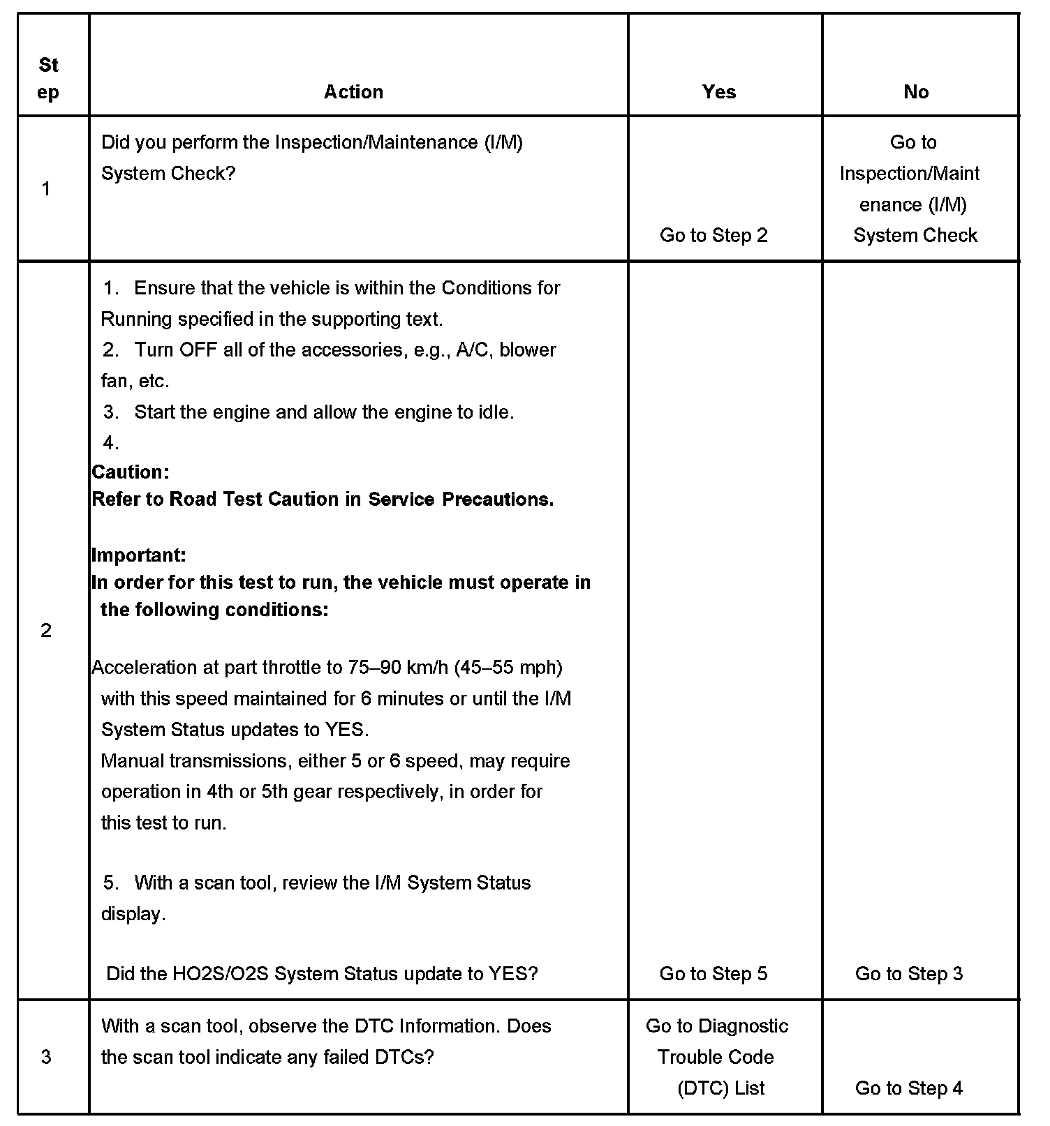 3. This step identifies a first failure of a type B DTC. A DTC only appears on the I/M System Status display when the DTC becomes a MIL illuminating DTC. This occurs on the second failure of a type B DTC. A first failure of a type B DTC will not allow the I/M System Status to update to YES. Refer to Diagnostic Aids.
