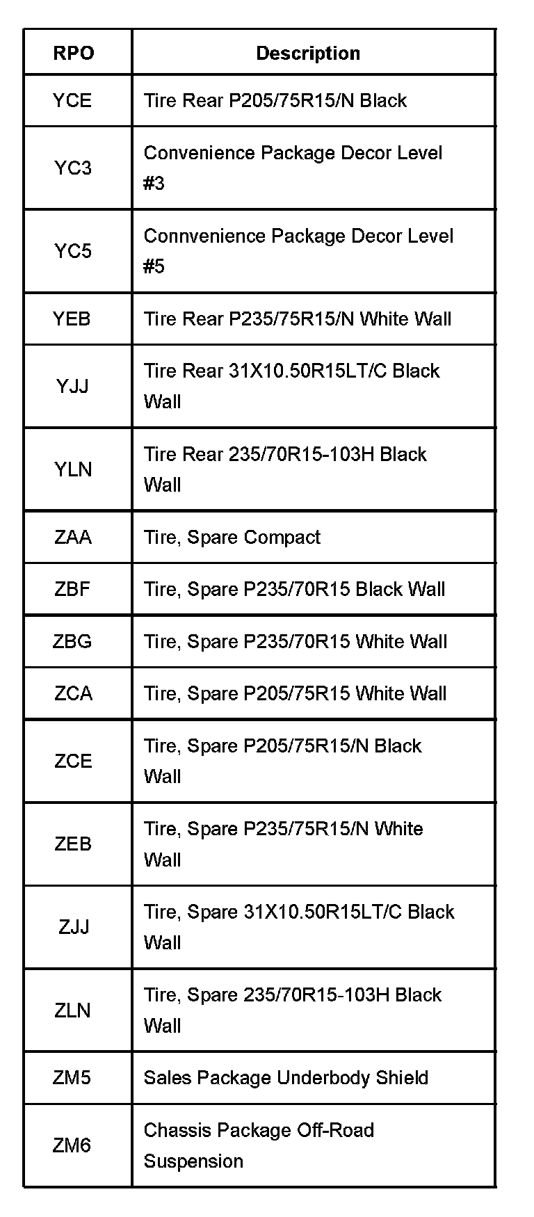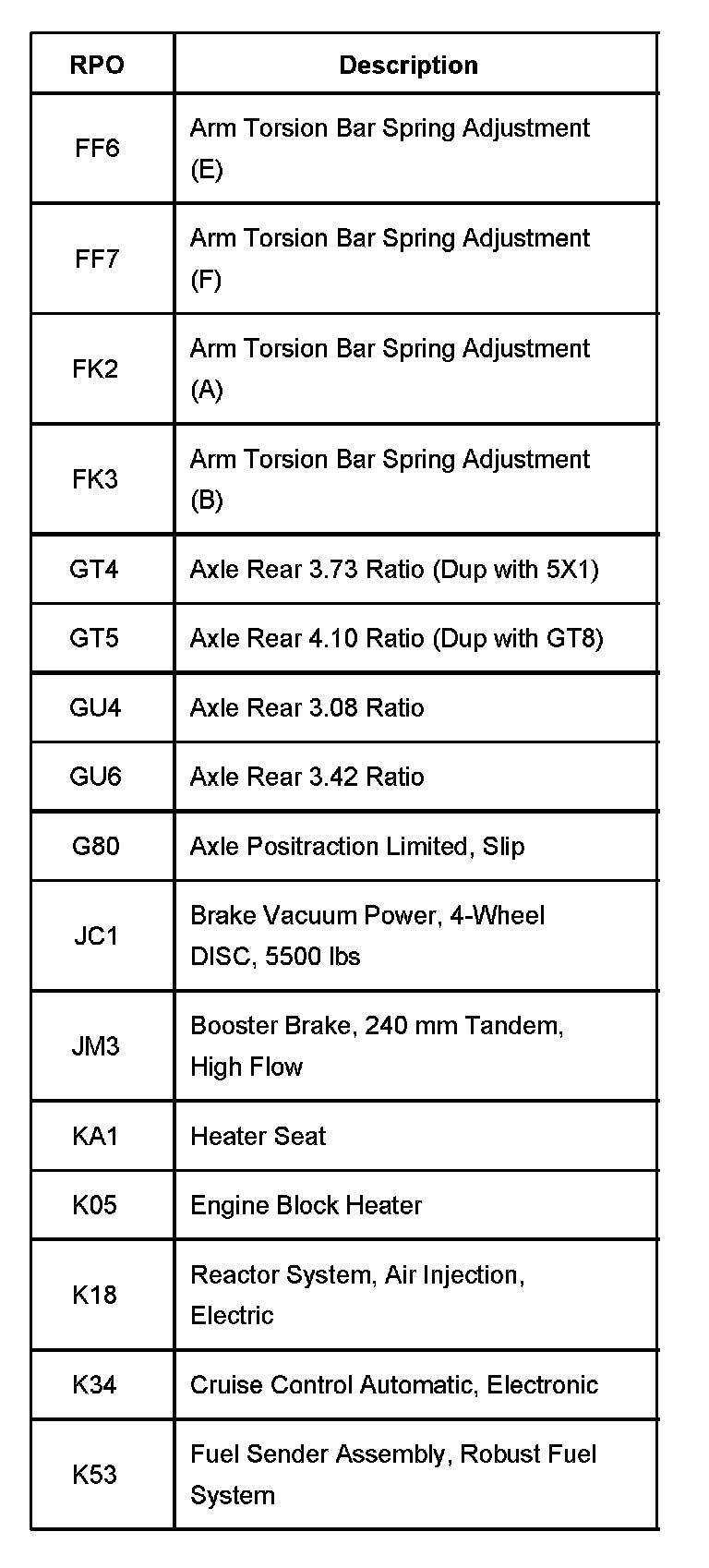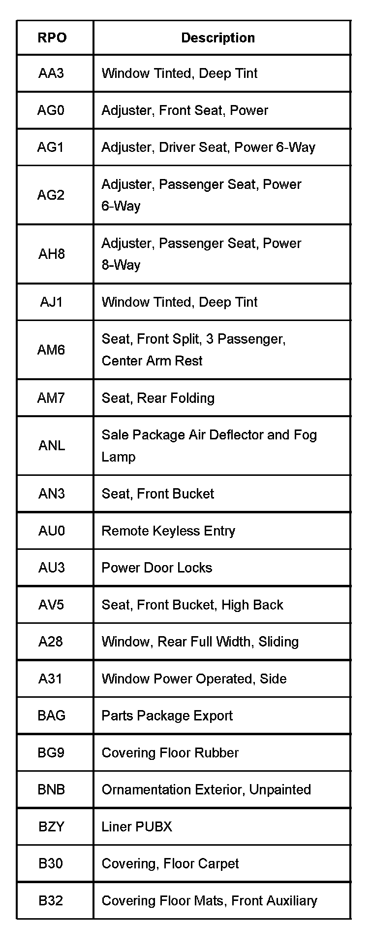 The production/process codes provide the description of the Regular Production Options (RPOs) used on the vehicle. The RPO list is printed on the Service Parts Identification Label. This is a list of the RPO abbreviations and the description.