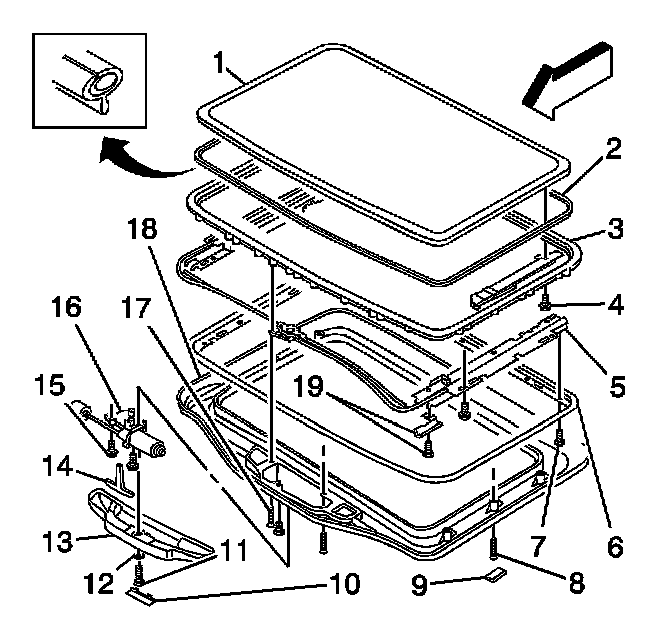 IMPORTANT: The sunroof module assembly can be removed without removing the sunroof motor/actuator from the lower frame. The sunroof window will need to be transferred to the new sunroof module assembly after removal.