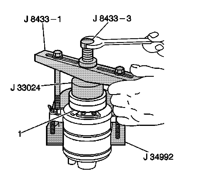 7. Turn the center forcing screw of the J 8433-1 in order to force the clutch coil onto the front head. Ensure that the clutch coil and the J 33024 remain aligned during installation.