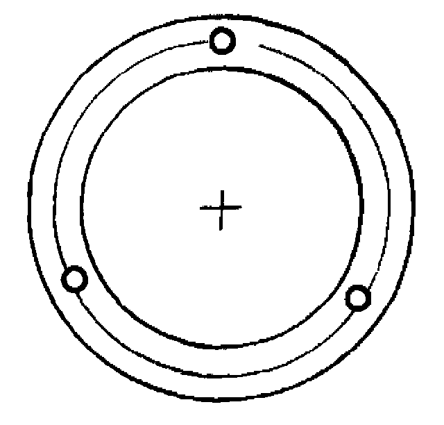 8. When the coil is fully seated on the front head, use a 1/8 inch diameter drift punch (2) in order to stake the front head at 3 places 120 degrees apart (3), in order to ensure that the clutch coil (1) remains in position.