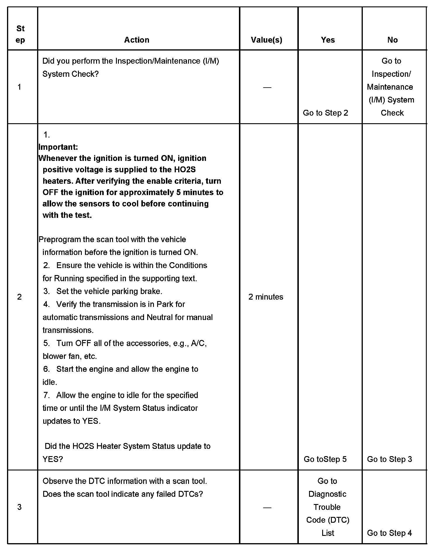 3. This step is to identify a first failure of a type B DTC. A DTC only appears on the I/M System Status display when the DTC becomes a MIL illuminating DTC. This occurs on the second failure of a type B DTC. A first failure of a type B DTC will not allow the I/M System Status to update to YES. Refer to Diagnostic Aids.