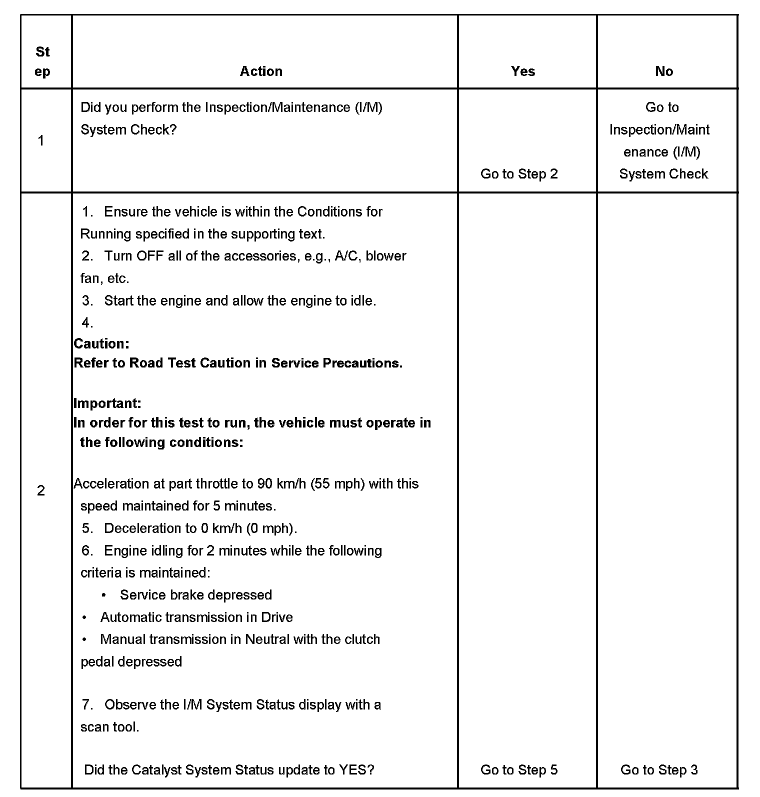 DESCRIPTIONThe purpose of this test is to satisfy the enable criteria necessary to execute I/M readiness diagnostics for the catalyst system. The test may be used to set the I/M System Status indicators to YES. Ensure the vehicle meets the requirements listed in Conditions for Running before performing this test. Failure to meet the necessary requirements may produce inaccurate test results.