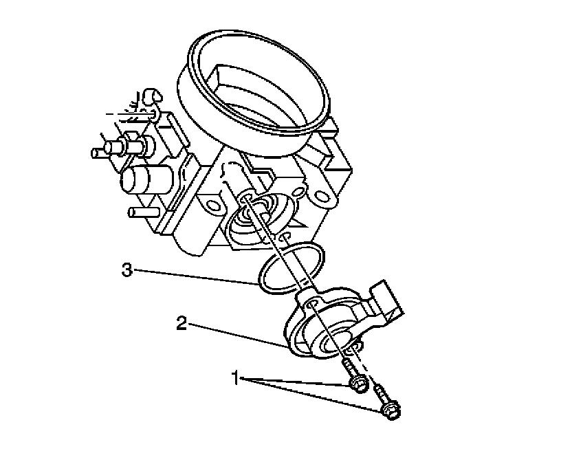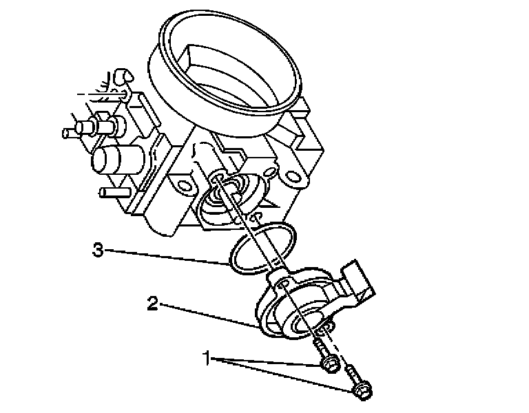 1. With the throttle valve in the normal closed (idle) position, install the TP sensor (2) and the seal (3) on the throttle body assembly.