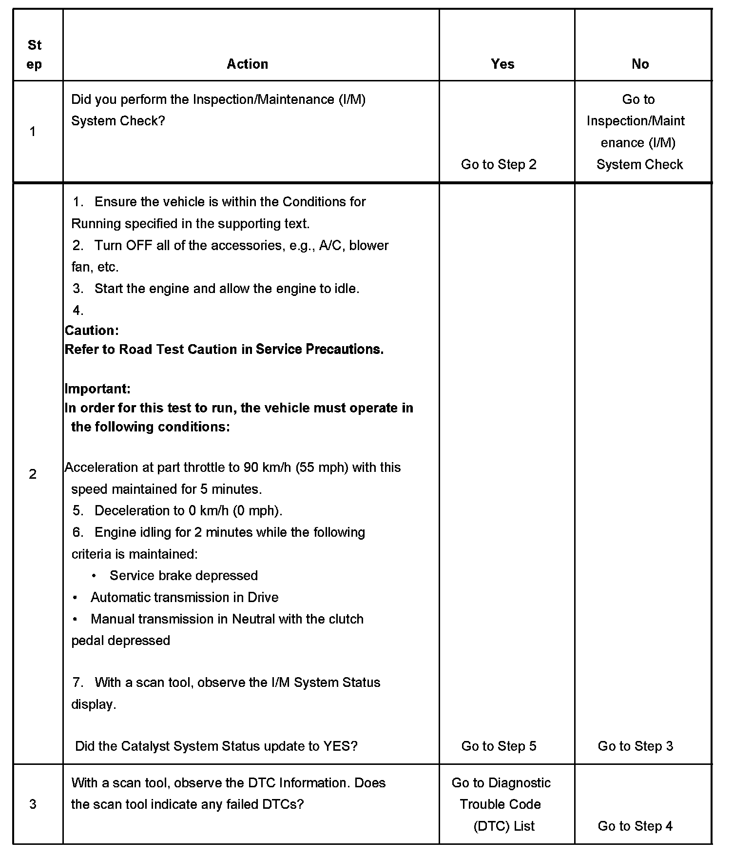 DESCRIPTIONThe purpose of this test is to satisfy the enable criteria necessary to execute I/M readiness diagnostics for the catalyst system. The test may be used to set the I/M System Status indicators to YES. Ensure the vehicle meets the requirements listed in Conditions for Running before performing this test. Failure to meet the necessary requirements may produce inaccurate test results.