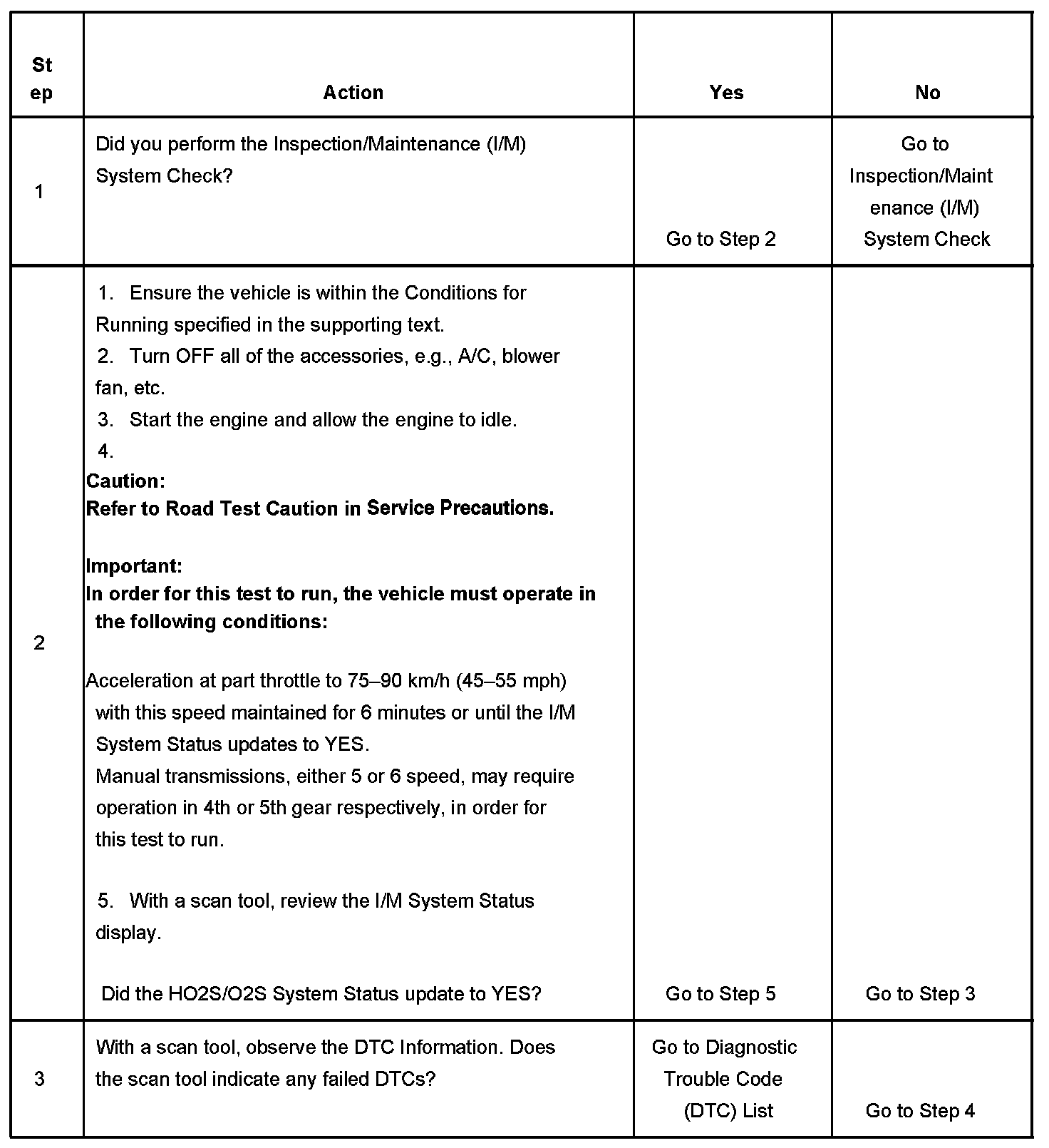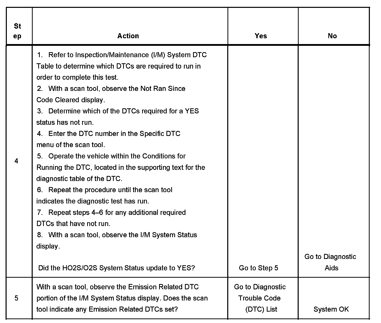 3. This step is to identify a first failure of a type B DTC. A DTC only appears on the I/M System Status display when the DTC becomes a MIL illuminating DTC. This occurs on the second failure of a type B DTC. A first failure of a type B DTC will not allow the I/M System Status to update to YES. Refer to Diagnostic Aids.