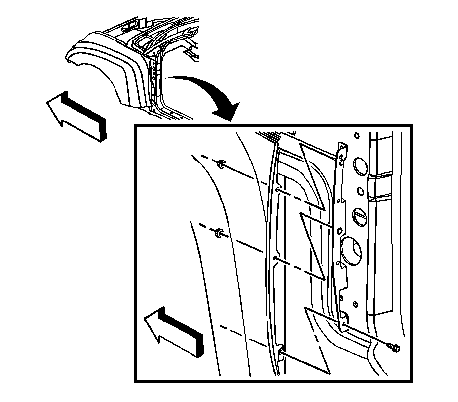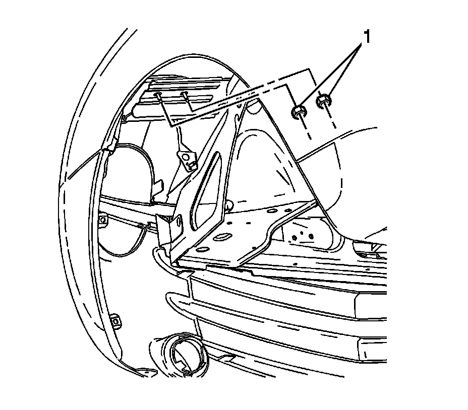 4. Remove the lower fender reinforcement fasteners. Refer to Fender Reinforcement Replacement - Lower (Fender Reinforcement Replacement - Lower) .