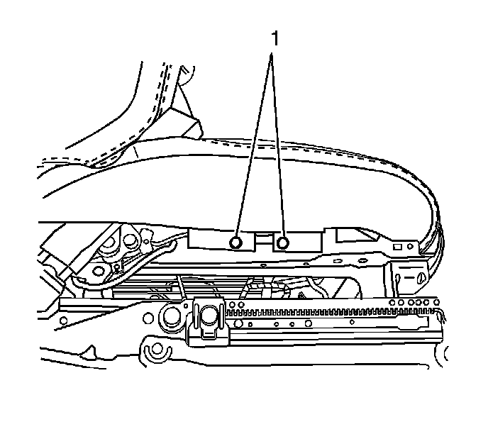 9. Install the push pins (1) that retain the seat cushion cover to the side of the seat cushion frame.