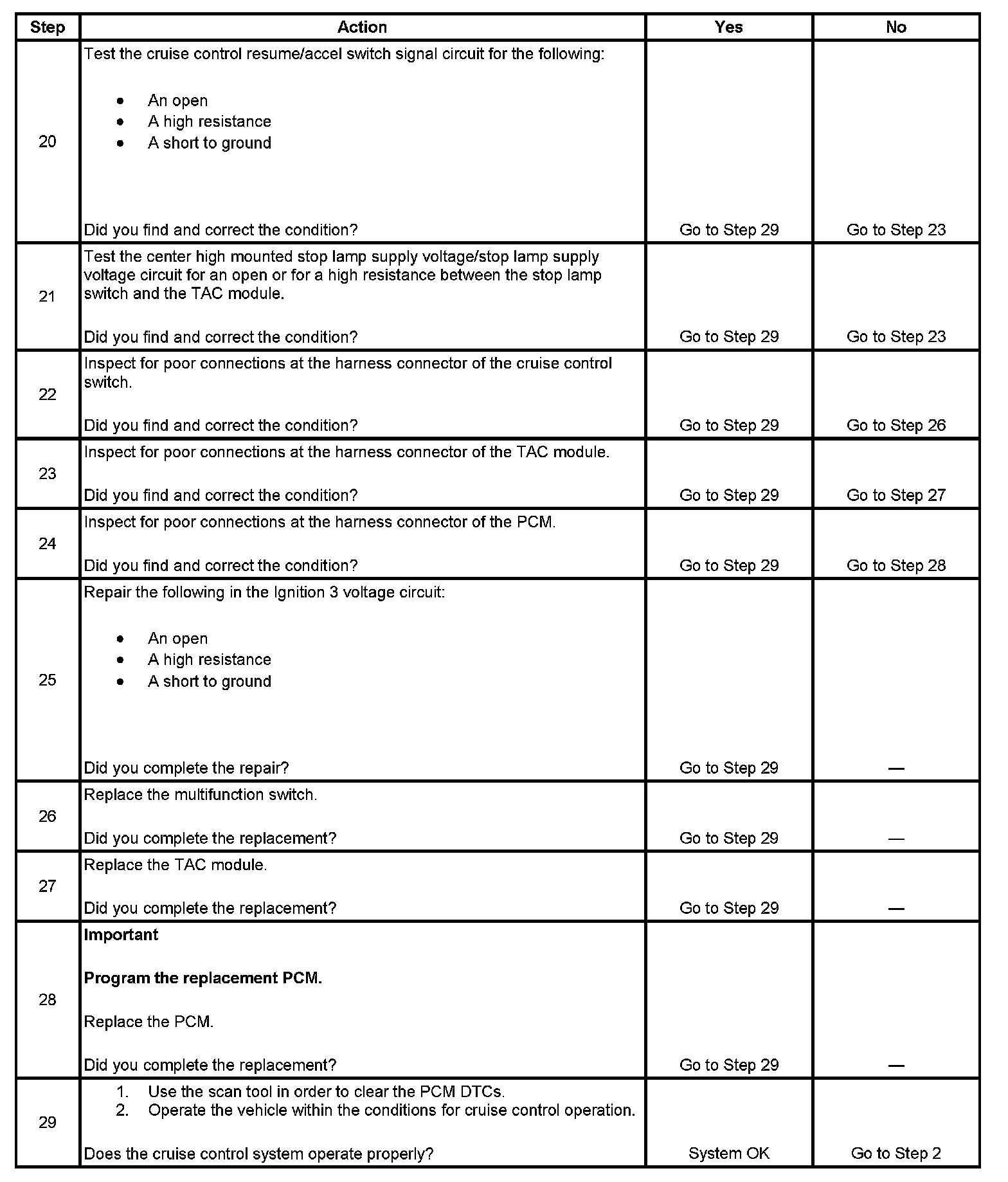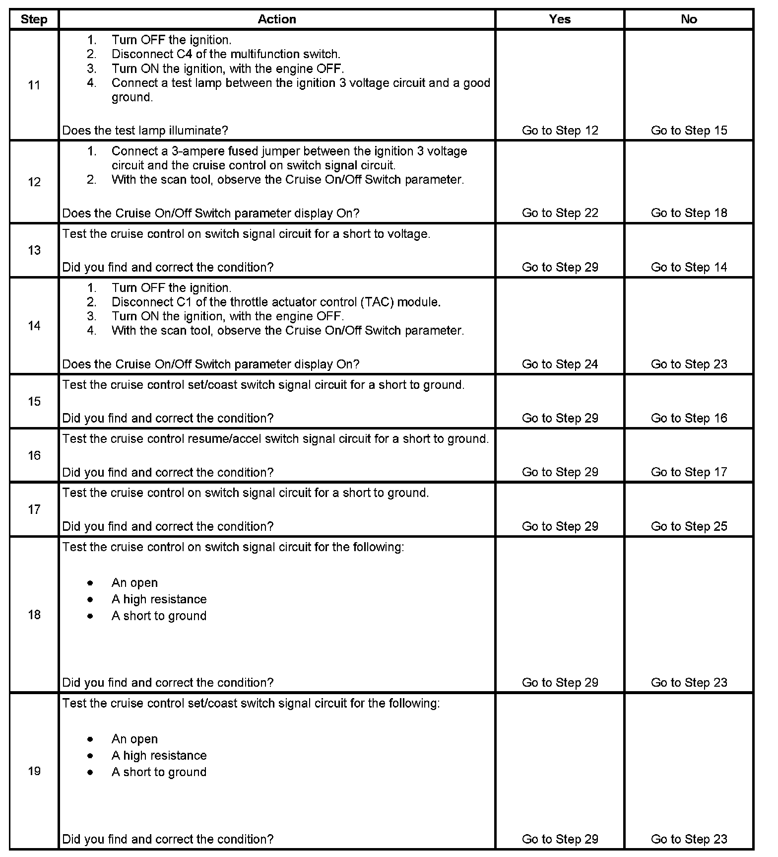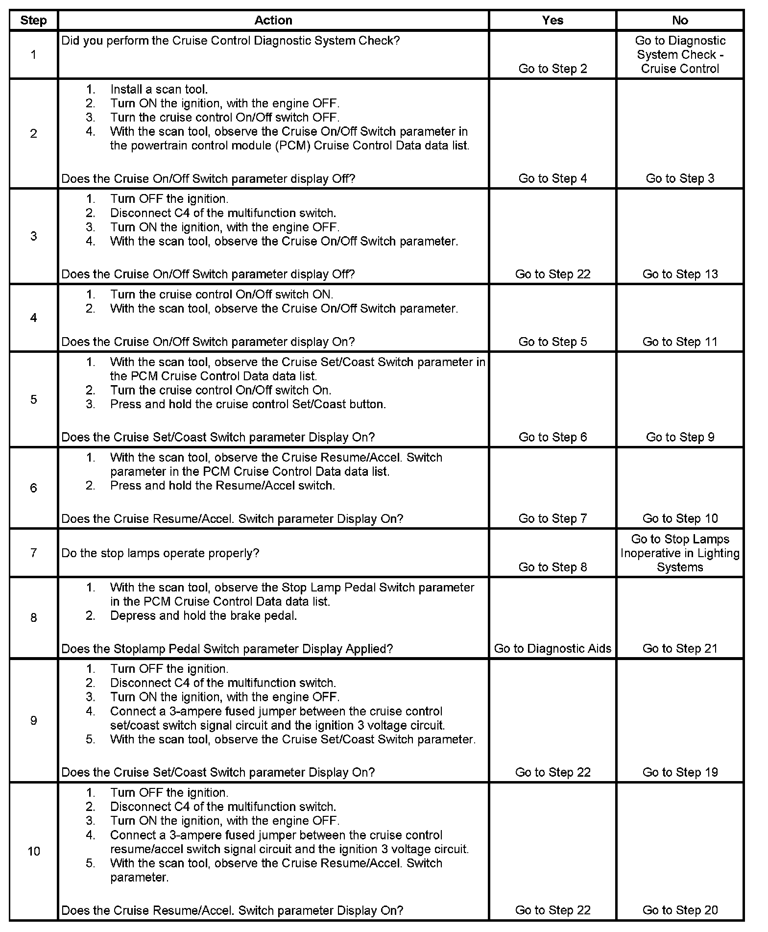 10. This step tests the cruise control resume/accel switch signal circuit for an open or for a high resistance.