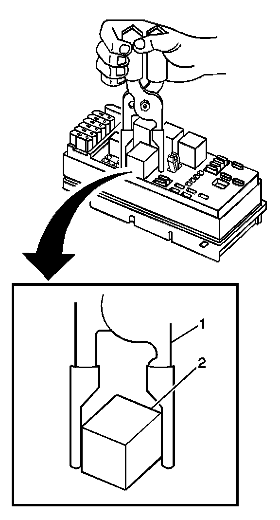 1. Using J 43244 (1) position the tool on opposing corners of the compressor relay (2).