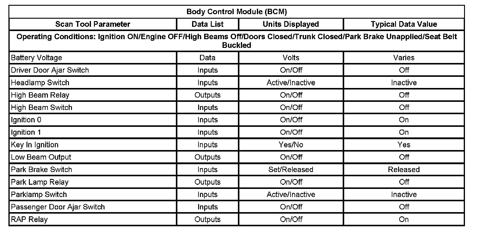 Scan Tool Data List - Body Control Module (BCM)