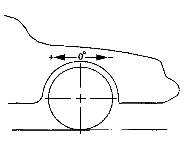 Camber is the tilting of the wheels from the vertical when viewed from the front of the vehicle. When the wheels tilt outward at the top, the camber is positive (+). When the wheel tilts inward at the top, the camber is negative (-). The amount of tilt is measured in degrees from the vertical. Camber settings influence the directional control and the tire wear.