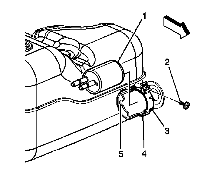 1. Install the fuel filter (1) into the bracket. Ensure that the fuel filter inlet tube is engaged in the fuel tank bracket orientation slot (5).