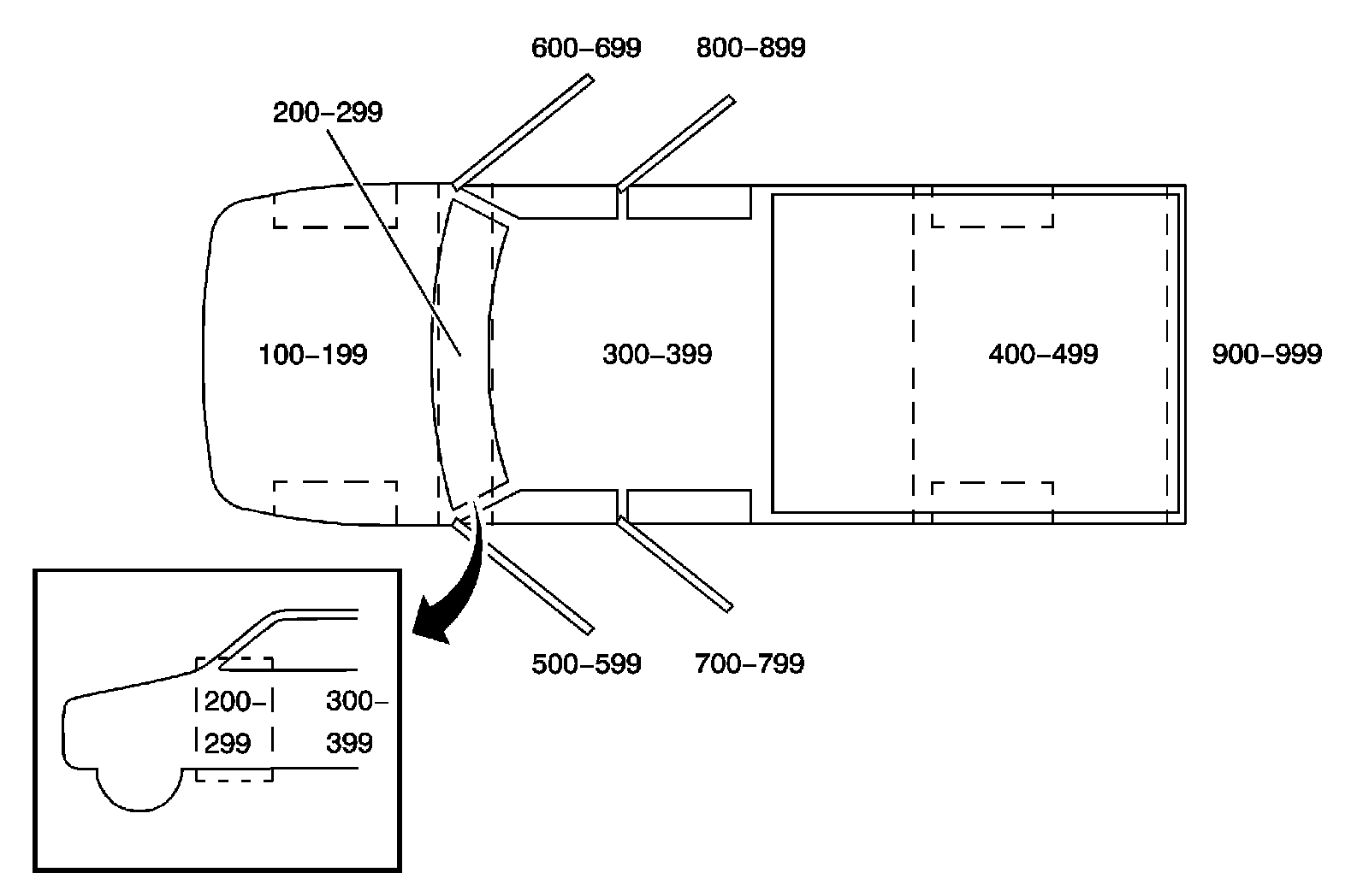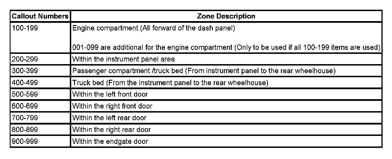 All grounds, in-line connectors, pass-through grommets, and splices have identifying numbers that corresponds to where they are located in the vehicle. The table explains the numbering system.
