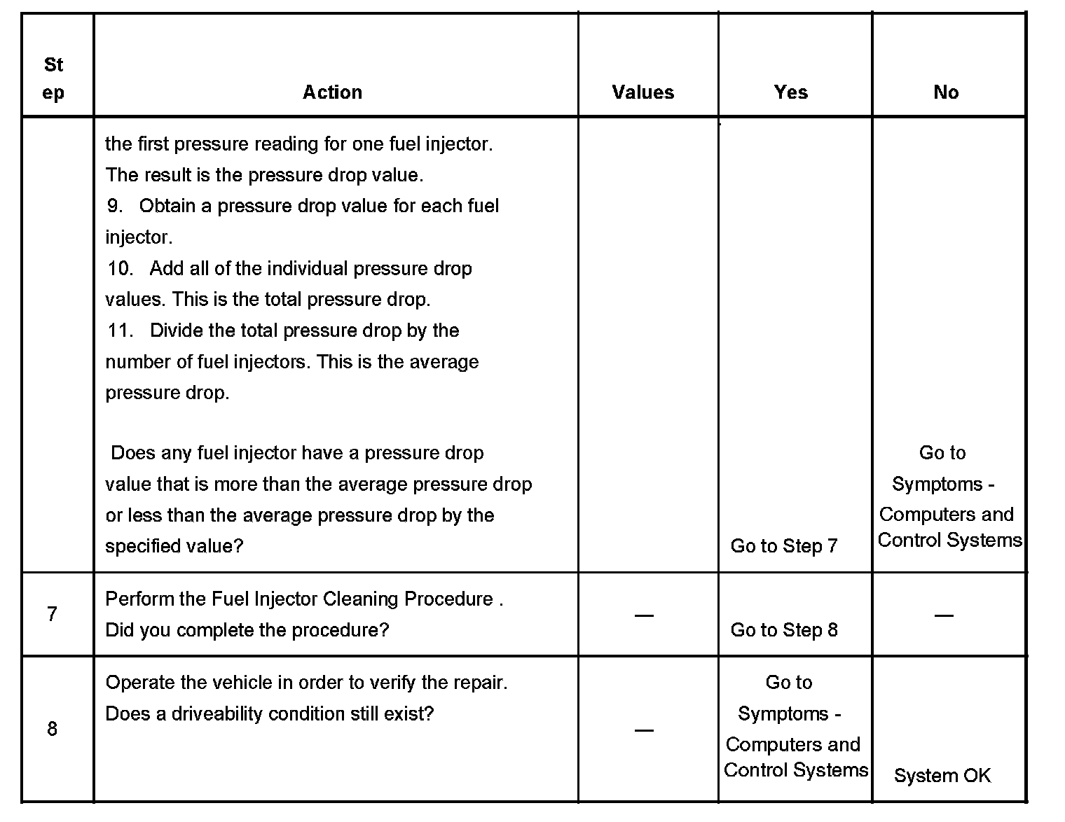6. If the pressure drop value for each fuel injector is within 10 kPa (1.5 psi) of the average pressure drop value, the fuel injectors are flowing properly. Calculate the pressure drop value for each fuel injector by subtracting the second pressure reading from the first pressure reading. Refer to the illustration.
