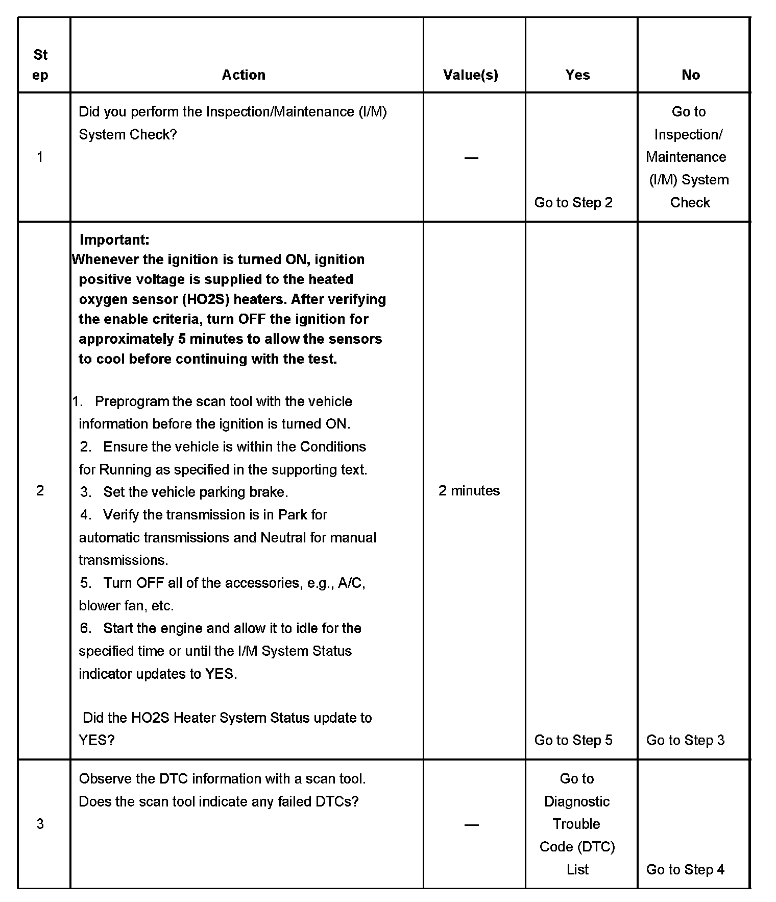The purpose of this test is to satisfy the enable criteria necessary to execute inspection/maintenance (I/M) readiness diagnostics for the heated oxygen sensor (HO2S) heater system. The test may be used to set the I/M System Status to YES. The I/M System Status display on the scan tool provides an indication of whether the control module has completed the required tests. The I/M System Status does not indicate that the tests have passed or failed. When all of the diagnostics for a specific system have run and passed, the I/M System Status will update to YES. If a test for a specific system has failed, the I/M System Status will update to YES, indicating a determination was made, even if all of the other tests for that system have not run.